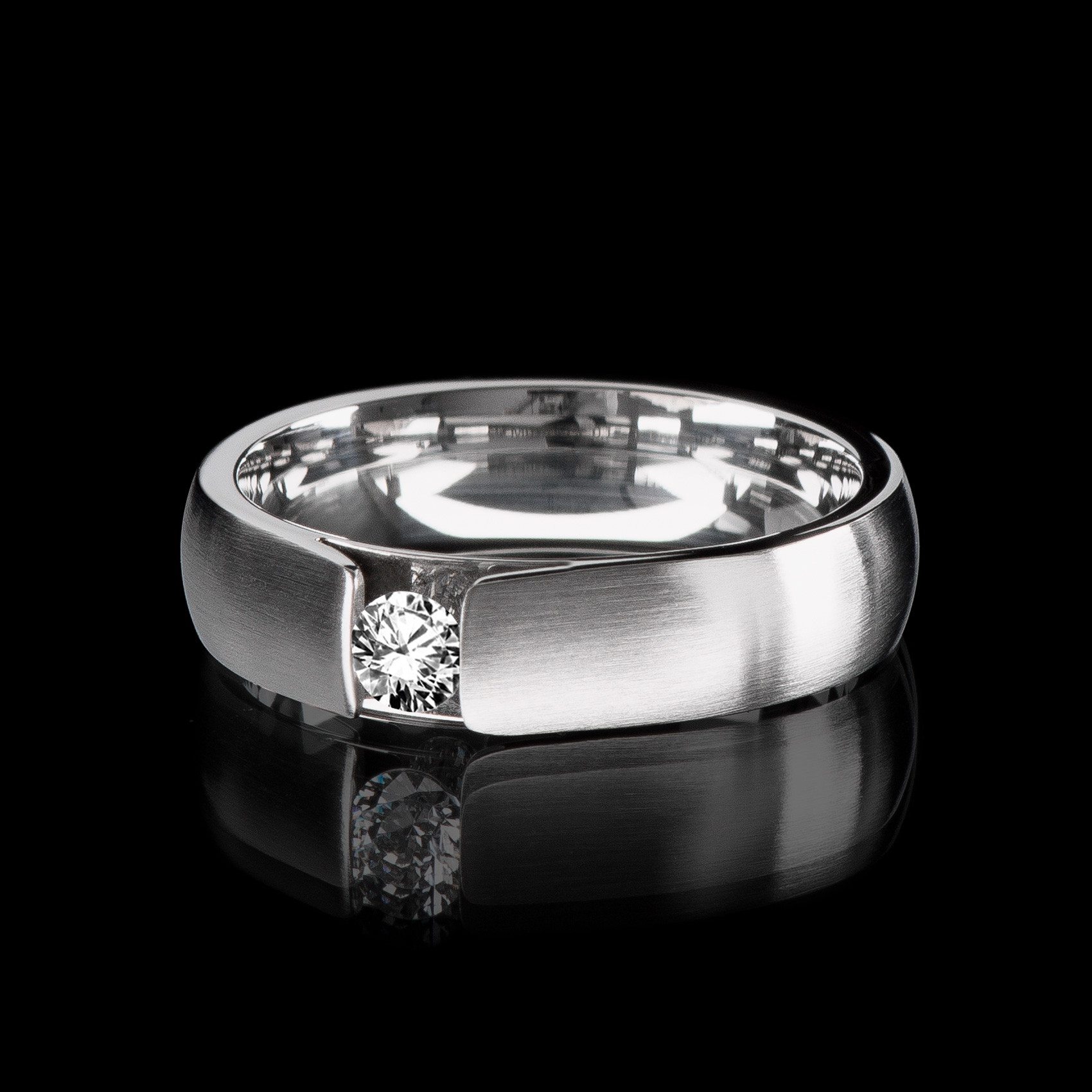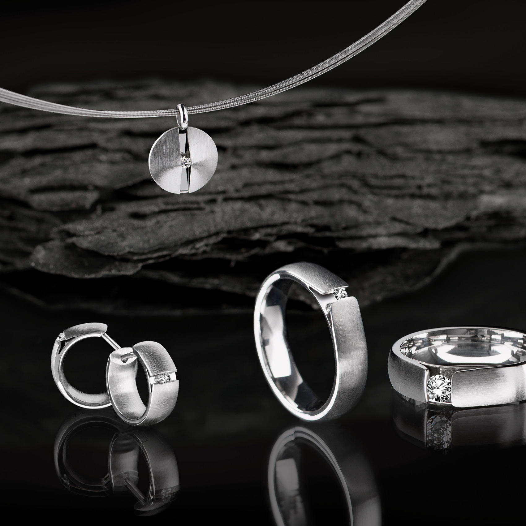Zeitlose Eleganz und edle Schlichtheit sind charakteristisch für die Brillantschmuck-Reihe aus unserer Manufaktur. Langweilig wirkt das zarte geometrische Design aber keinesfalls. Matte und glänzenden Oberflächen im Wechsel verleihen den Preziosen eine unaufdringlich Spannung, die von funkelnden Brillanten gekrönt wird.