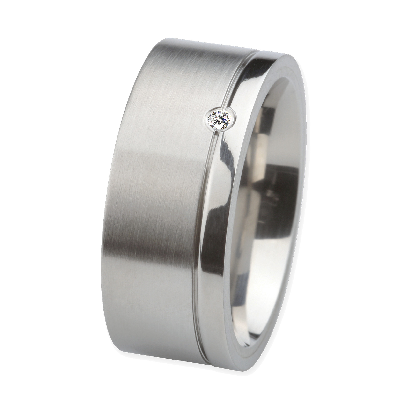 Dieser Ring aus hochwertigem Edelstahl wurde in eigener Manufaktur hergestellt und ist mit viel Herzblut gefertigt worden. Die elegante Kombination aus mattierter Oberfläche und poliertem Rand verleiht dem kostbaren Brillanten eine einzigartige Ausstrahlung.