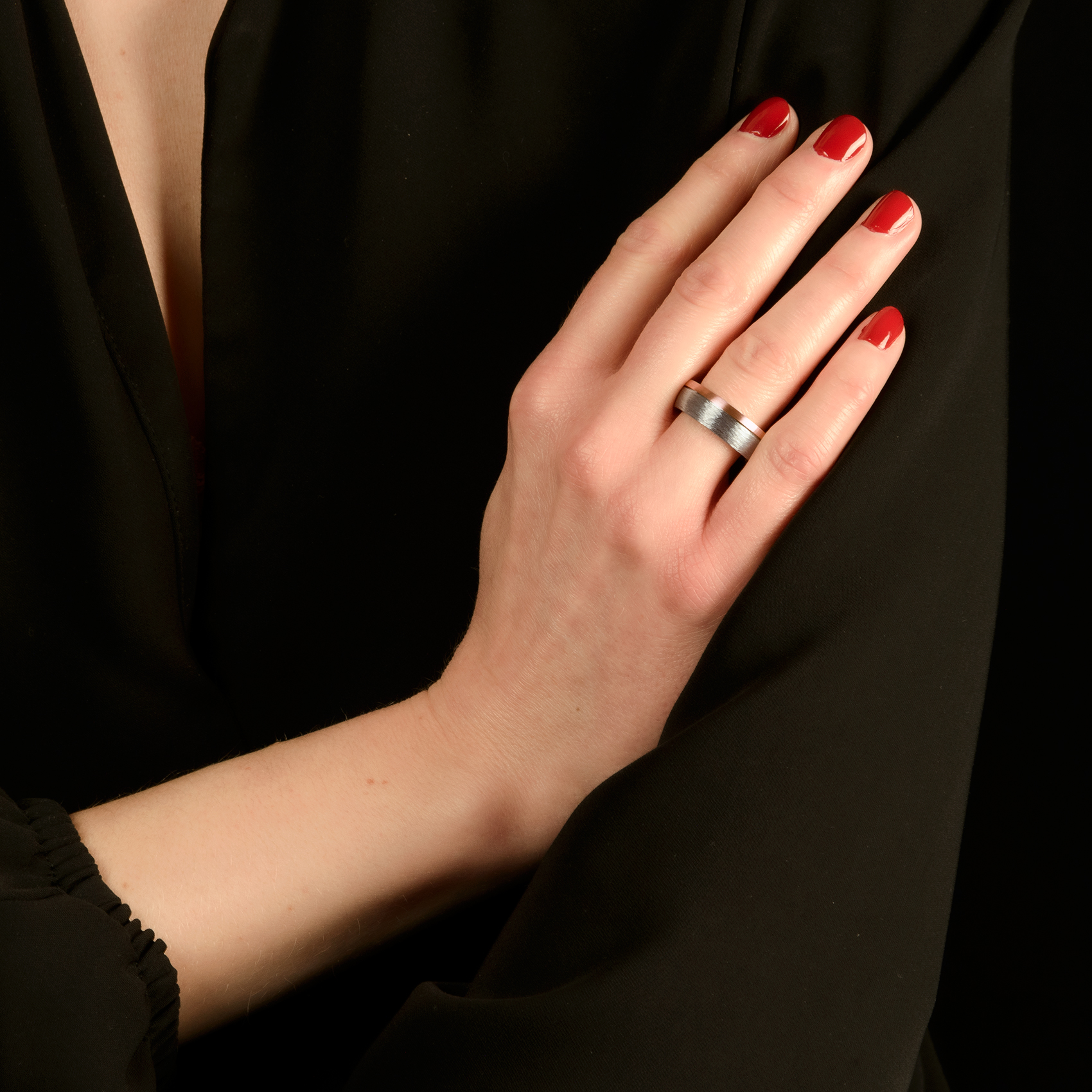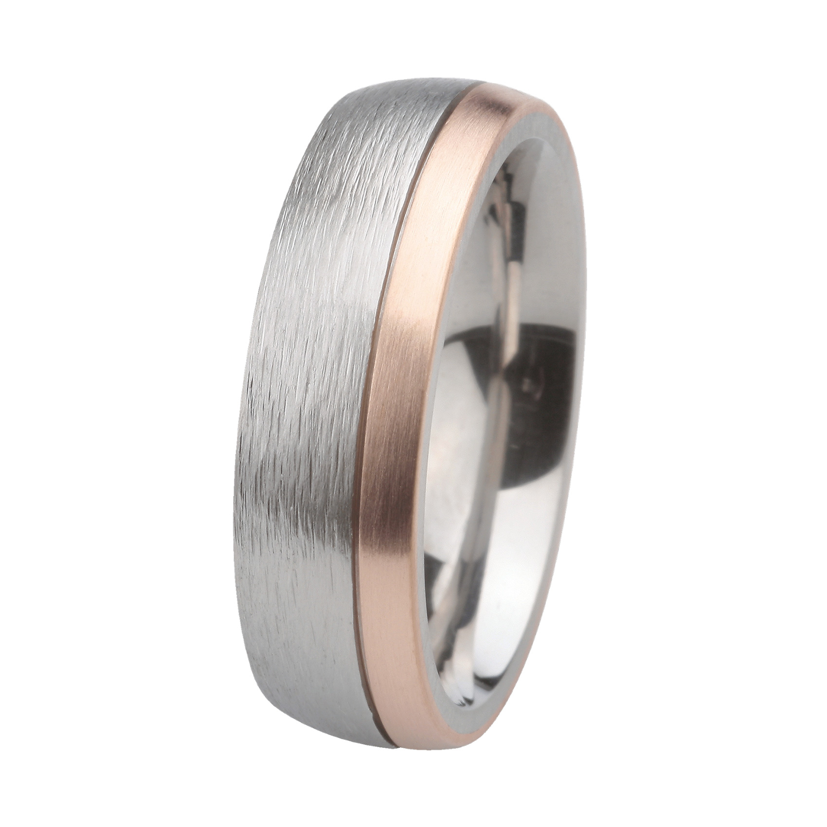 Dieser Ring aus hochwertigem Edelstahl mit 585er-Roségold wurde in eigener Manufaktur hergestellt und ist mit viel Herzblut gefertigt worden. Die elegante, geschliffene Oberfläche in Kombination mit dem Roségold, verleiht dem Ring eine einzigartige Ausstrahlung. Partnerringe von ERNSTES DESIGN bestechen nicht nur durch individuelles Design, sondern vor allem auch durch ihre vielfältigen Materialkompositionen. Wir arbeiten mit spannenden Kombinationen aus Edelstahl und 585er Gelbgold, Roségold sowie Platin. Unsere Kollektionen fertigen wir in unserer Schmuckmanufaktur in Nordhorn aus hochwertigem, antiallergischem Edelstahl mit geschliffenen, mattierten oder polierten Oberflächen. Unsere Veredelungen verleihen den Ringen eine besondere Wertigkeit.
