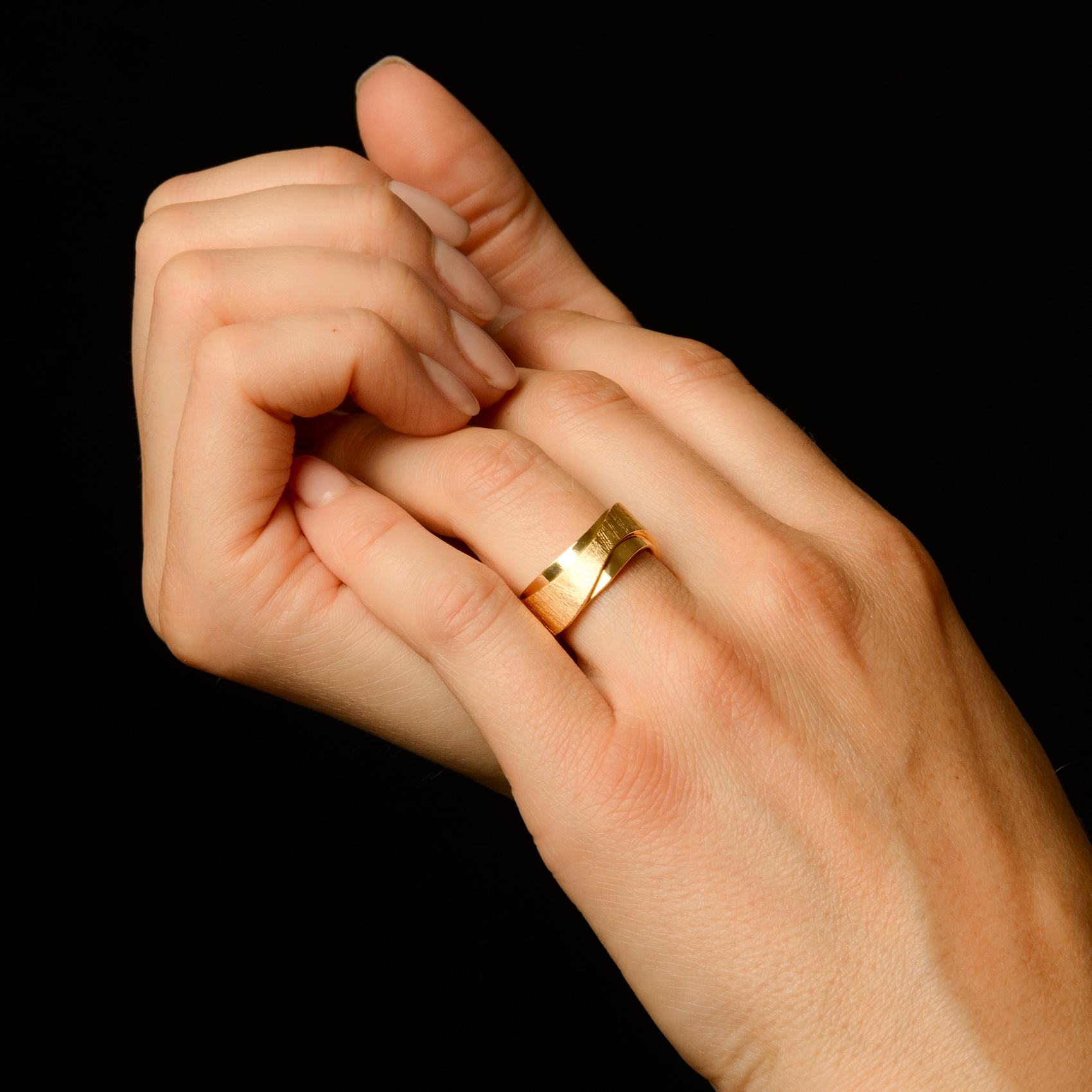 Mit seiner eleganten Form, sanftem Glanz und zeitloser Schönheit verleiht der asymmetrisch geschwungene Ring aus Edelstahl jedem Look eine moderne Note.