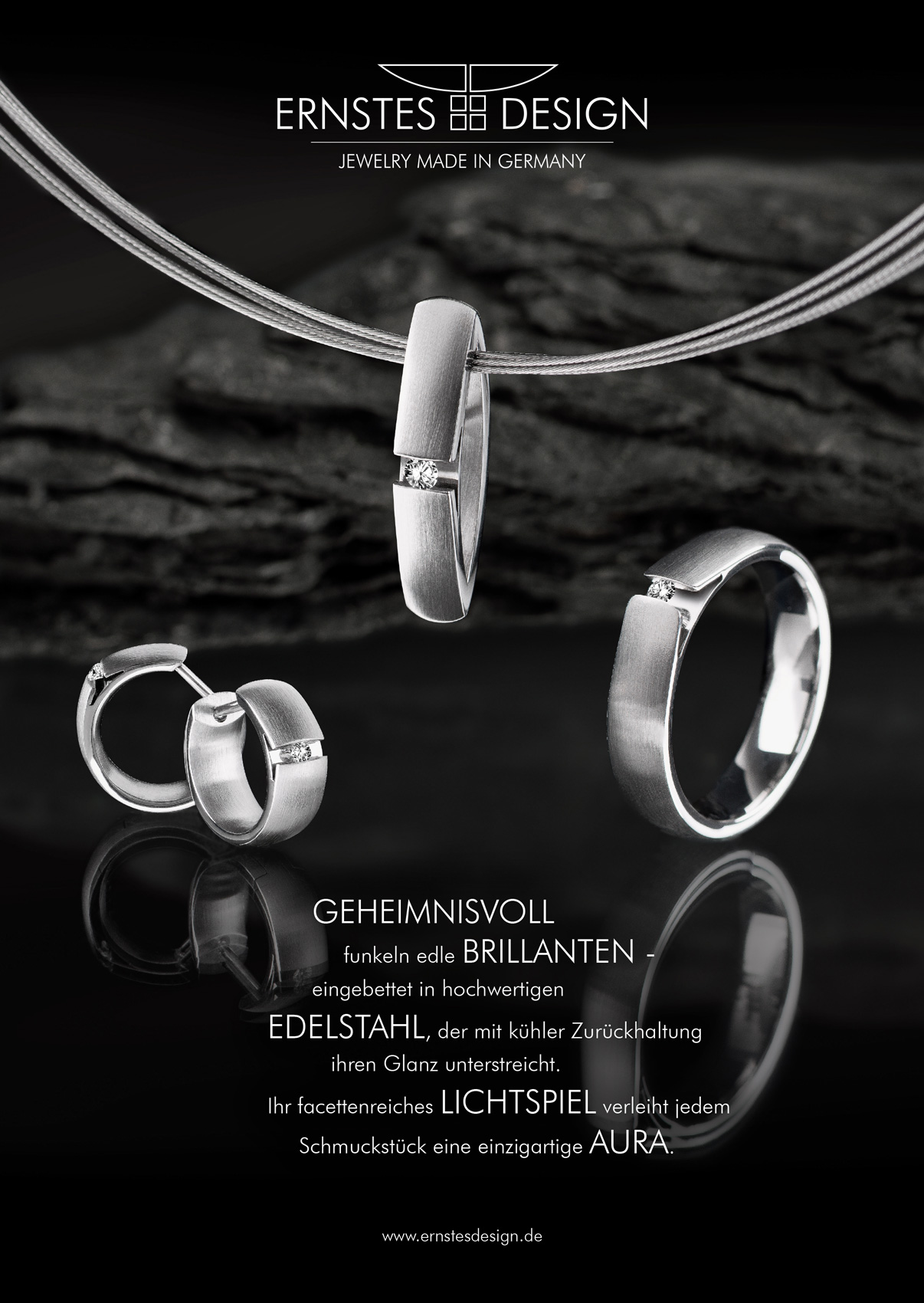 Der moderne Anhänger aus Edelstahl ist mit einer glänzenden, polierten Oberfläche und einem kostbaren Brillanten versehen, der durch seine besondere Fassung, für eine Extraportion Eleganz beiträgt. Der zeitlos schöne Anhänger ist ein unverzichtbares Accessoire für jeden Anlass und kann mit einer Kette oder einem Seil getragen werden. Nichts schmückt Sie so glanzvoll schön wie Brillantschmuck. Ob als Anhänger an einer Kette, als funkelndes Accessoires in Ihren Ohren oder in Form eines Ringes an Ihrer Hand - lassen Sie sich brillant verzaubern. Die wunderschöne Kombination aus stilvoller, zeitloser Eleganz und edlen Materialien, macht die Schmuckstücke von ERNSTES DESIGN zu einem einzigartigen Erlebnis.
