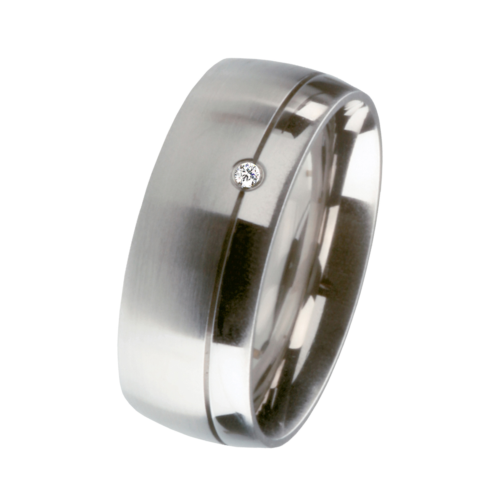 Der zeitlos schöne Ring aus unserer Schmuckmanufaktur ist aus hochwertigem Edelstahl gefertigt und besticht durch die glänzende polierte in Kombination mit der matten Oberfläche. Der kostbare Brillant verleiht dem Ring einen Hauch von Eleganz.