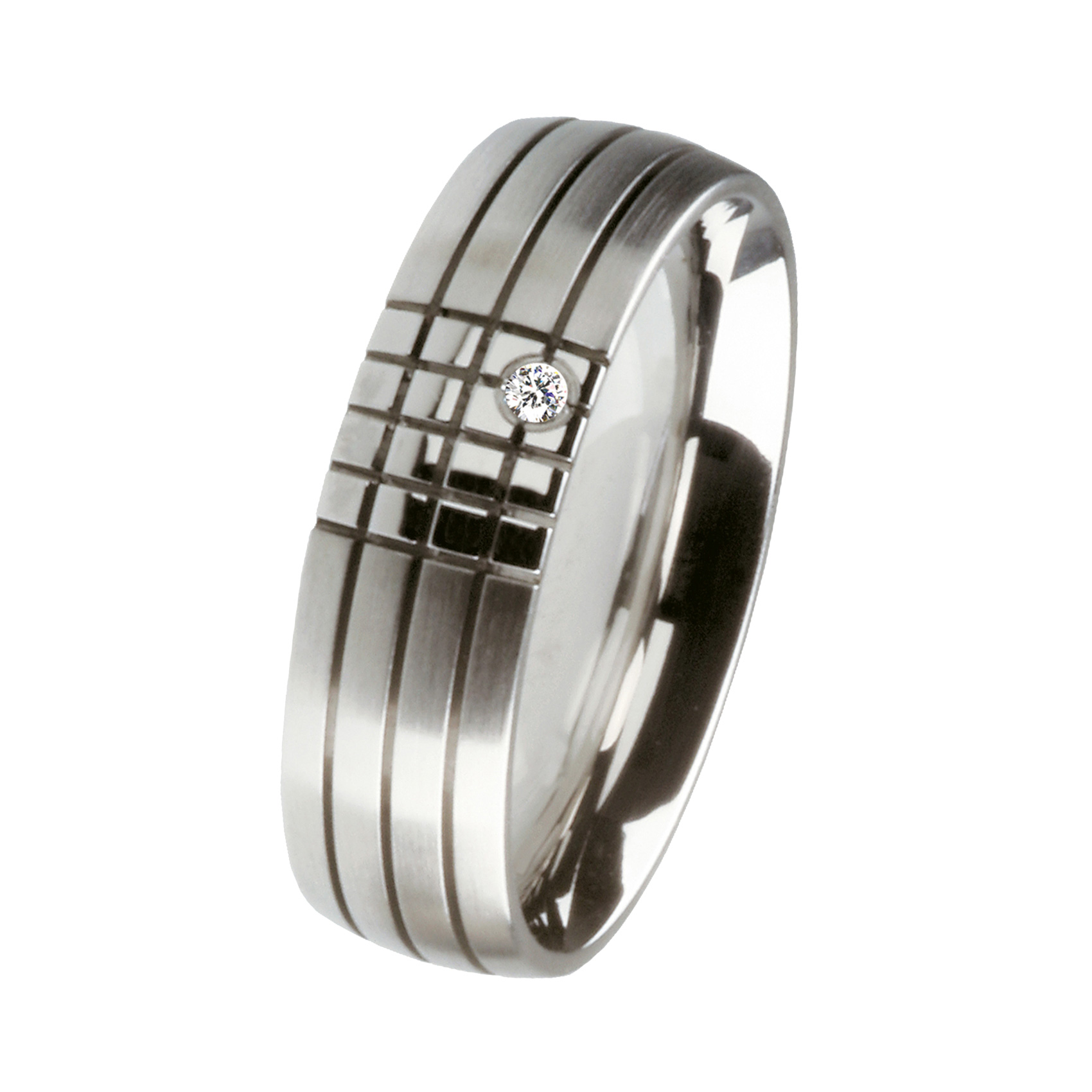 Ein besonderes Merkmal dieses Edelstahlrings aus unserer Manufaktur sind die Rauten, die durch die stilvoll matt polierte Oberfläche dem Ring Ausdruck verleihen. Der strahlende Brillant verleiht dem Ring zusätzlich ein Hauch Eleganz.