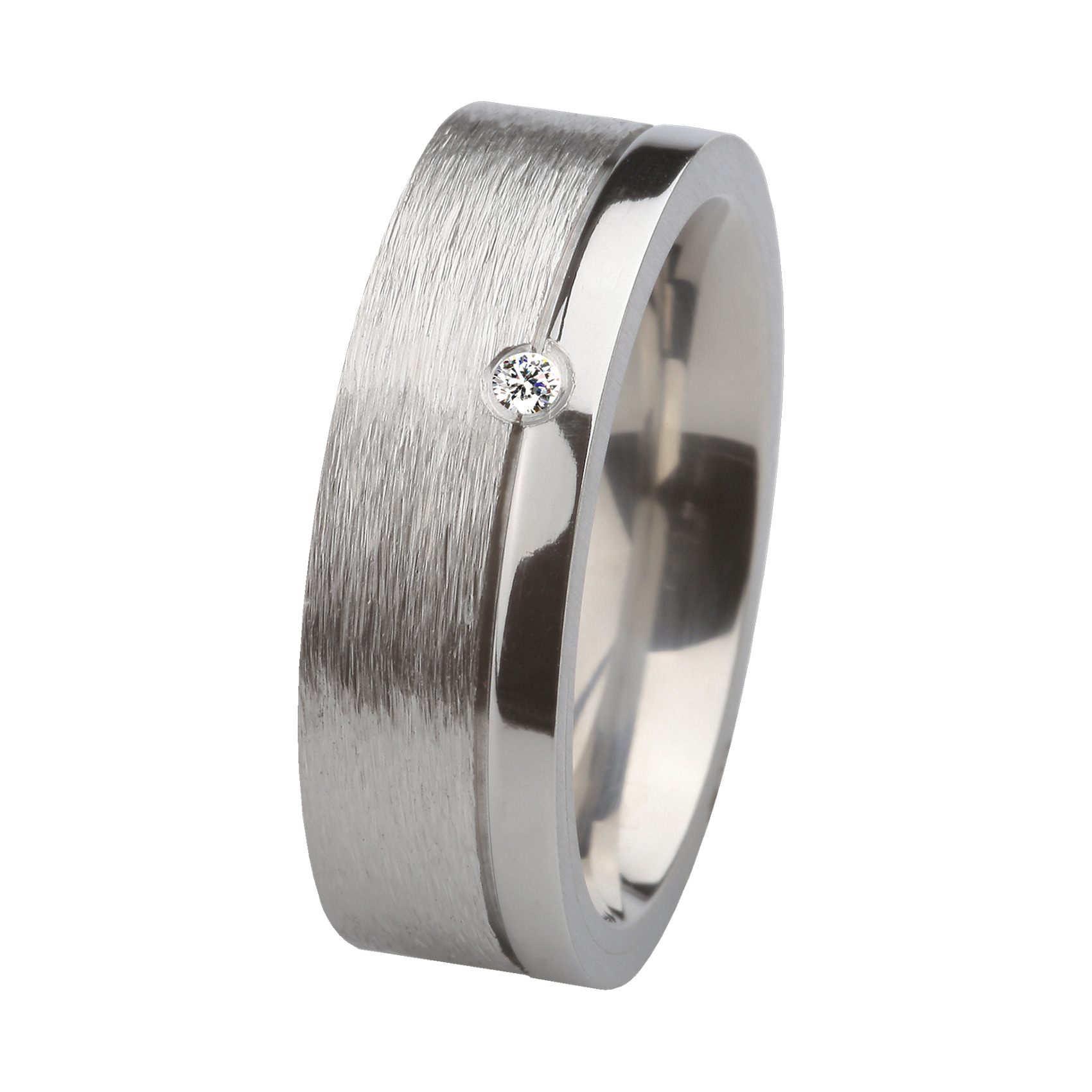 Dieser Ring aus hochwertigem Edelstahl wurde in eigener Manufaktur hergestellt und ist mit viel Herzblut gefertigt worden. Die elegante Kombination aus geschliffener Oberfläche und poliertem Rand verleiht dem kostbaren Brillanten eine einzigartige Ausstrahlung.