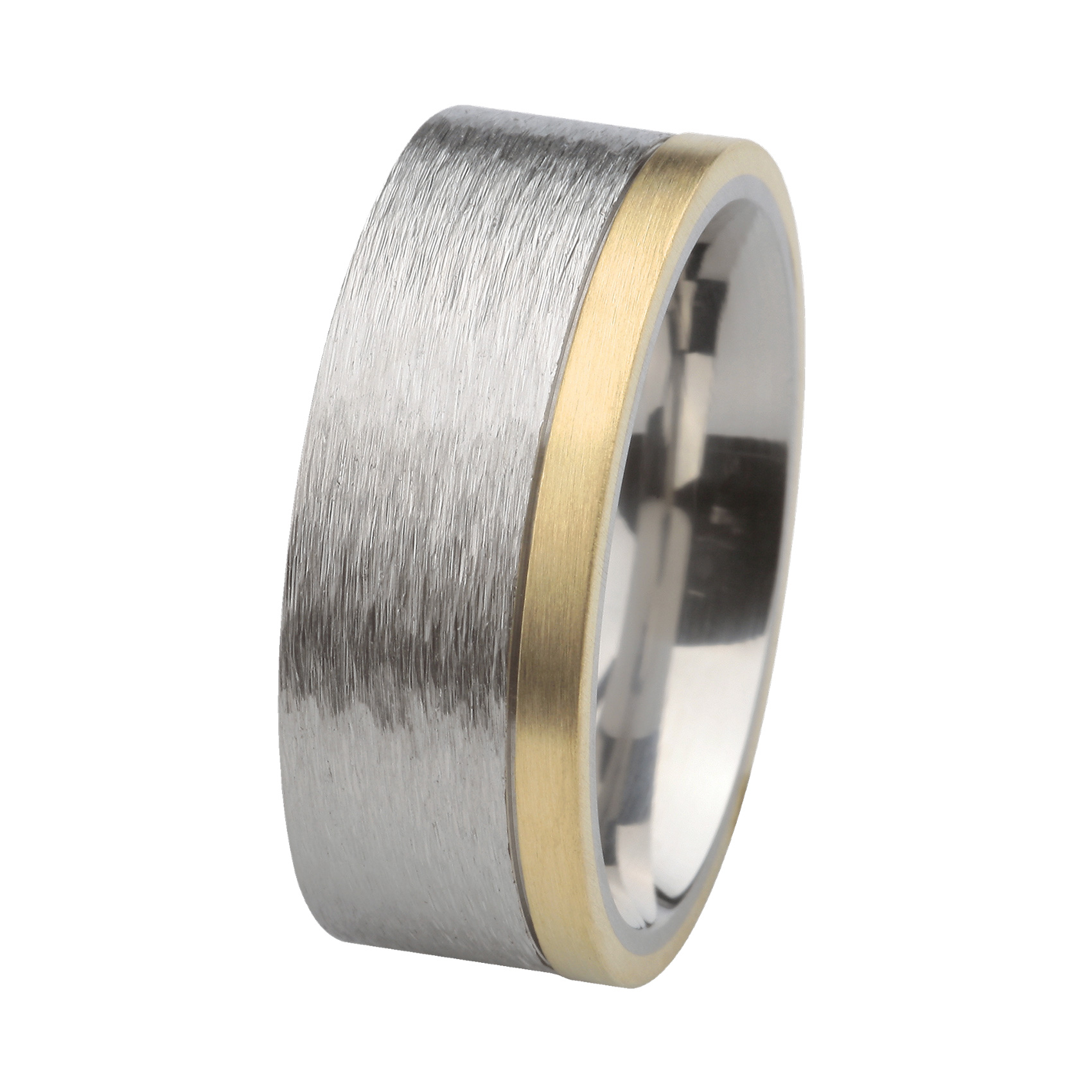 Dieser Ring aus hochwertigem Edelstahl mit 585er-Gelbgold wurde in eigener Manufaktur hergestellt und ist mit viel Herzblut gefertigt worden. Die geschliffene Oberfläche in Kombination mit dem matten Gelbgold verleiht dem Ring eine einzigartige Ausstrahlung.