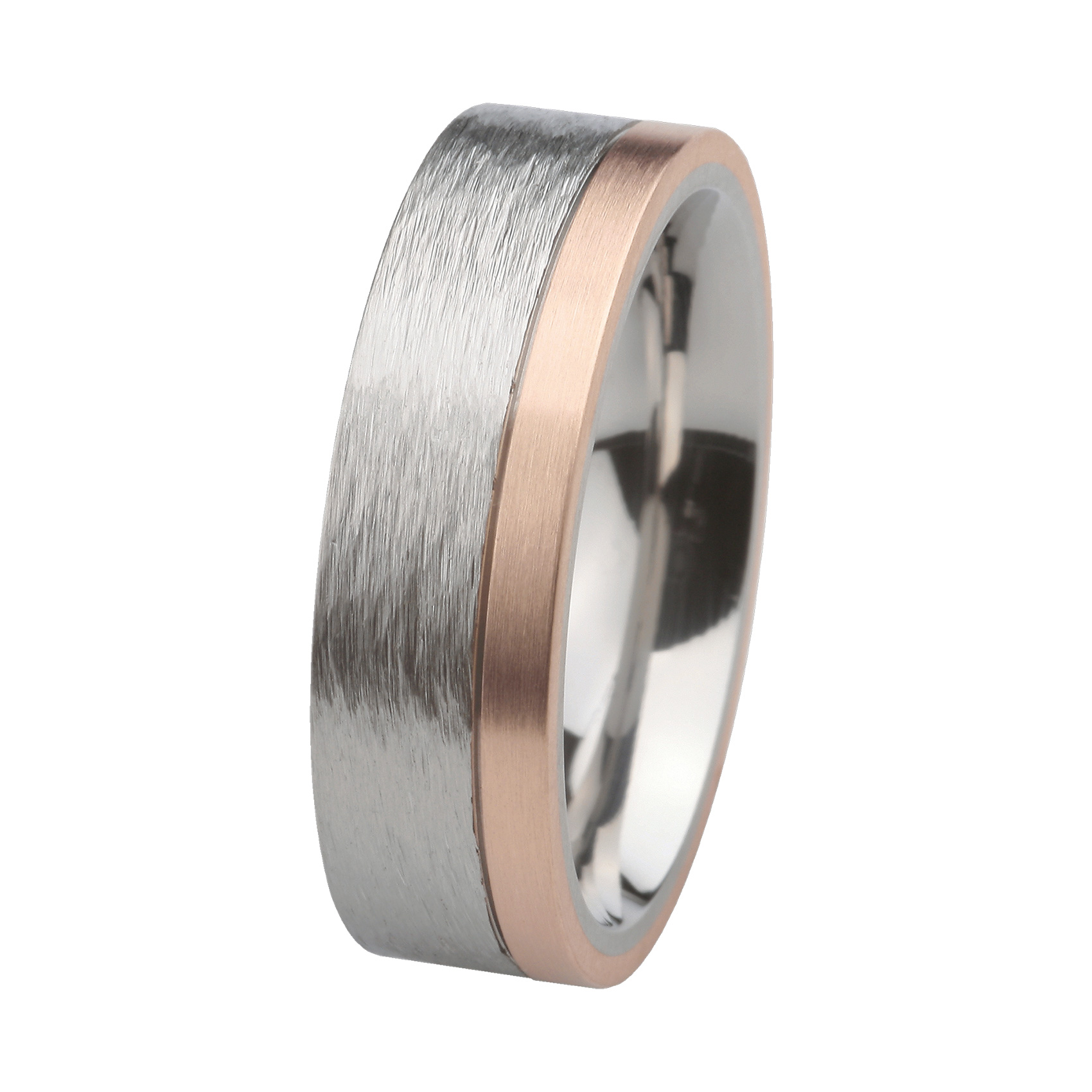Dieser Ring aus hochwertigem Edelstahl mit 585er-Roségold wurde in eigener Manufaktur hergestellt und ist mit viel Herzblut gefertigt worden. Die gerade, geschliffene Oberfläche in Kombination mit dem matten Roségold, verleiht dem Ring eine einzigartige Ausstrahlung.