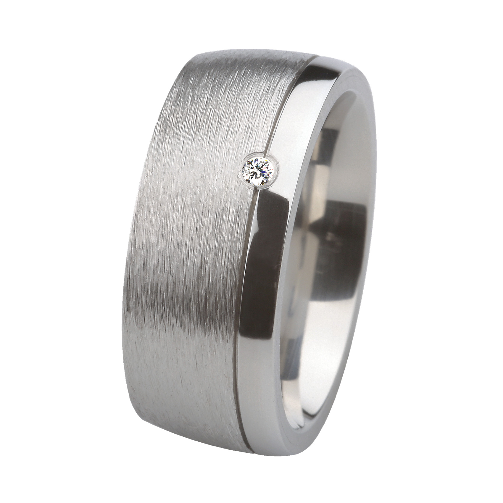 Dieser Ring aus hochwertigem Edelstahl wurde in eigener Manufaktur hergestellt und ist mit viel Herzblut gefertigt worden. Die elegante Kombination aus geschliffener Oberfläche und poliertem Rand verleiht dem kostbaren Brillanten eine einzigartige Ausstrahlung.