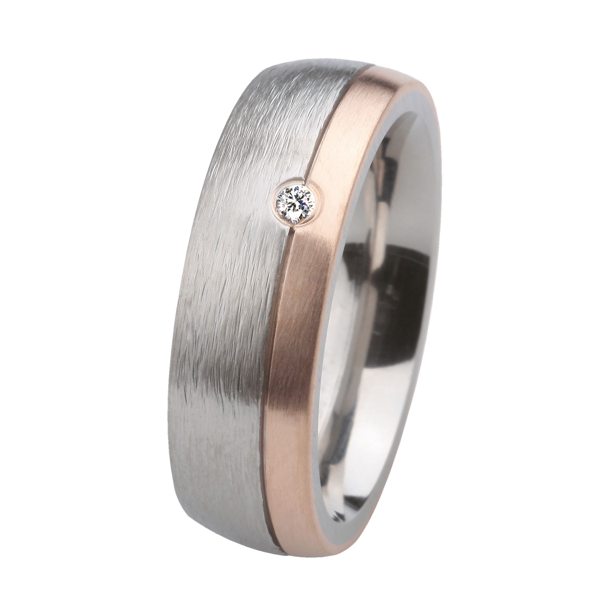 Dieser Ring aus hochwertigem Edelstahl mit 585er-Roségold wurde in eigener Manufaktur hergestellt und ist mit viel Herzblut gefertigt worden. Die elegante, geschliffene Oberfläche in Kombination mit dem Roségold, verleiht dem kostbaren Brillanten eine einzigartige Ausstrahlung.